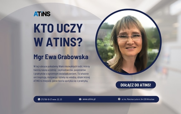 Dziś przedstawiamy mgr Ewę Grabowską – osobę, która od 2005 roku związana jest z naszą Uczelnią i odgrywa ogromną rolę zarówno w dydaktyce, jak i w życiu instytucjonalnym ATINS.